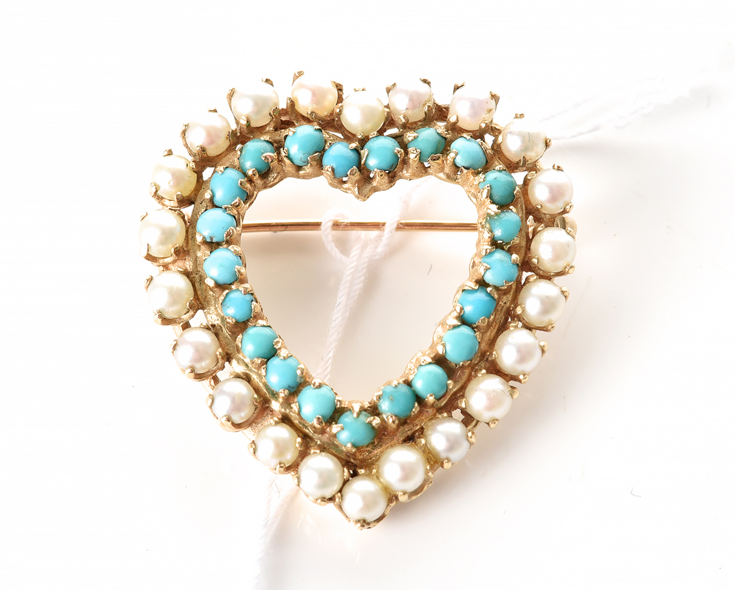 A TURQUOISE BEAD AND SEED PEARL HEART BROOCH IN 14CT GOLD, LENGTH 30MM, 8.4GMS