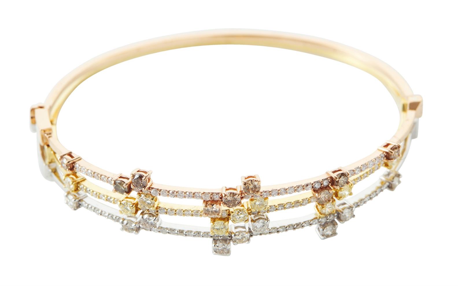 The bangles present in excellent, as new condition. Yellow gold bangle contains yellow diamonds, rose gold bangle contains champagne/cognac diamonds.