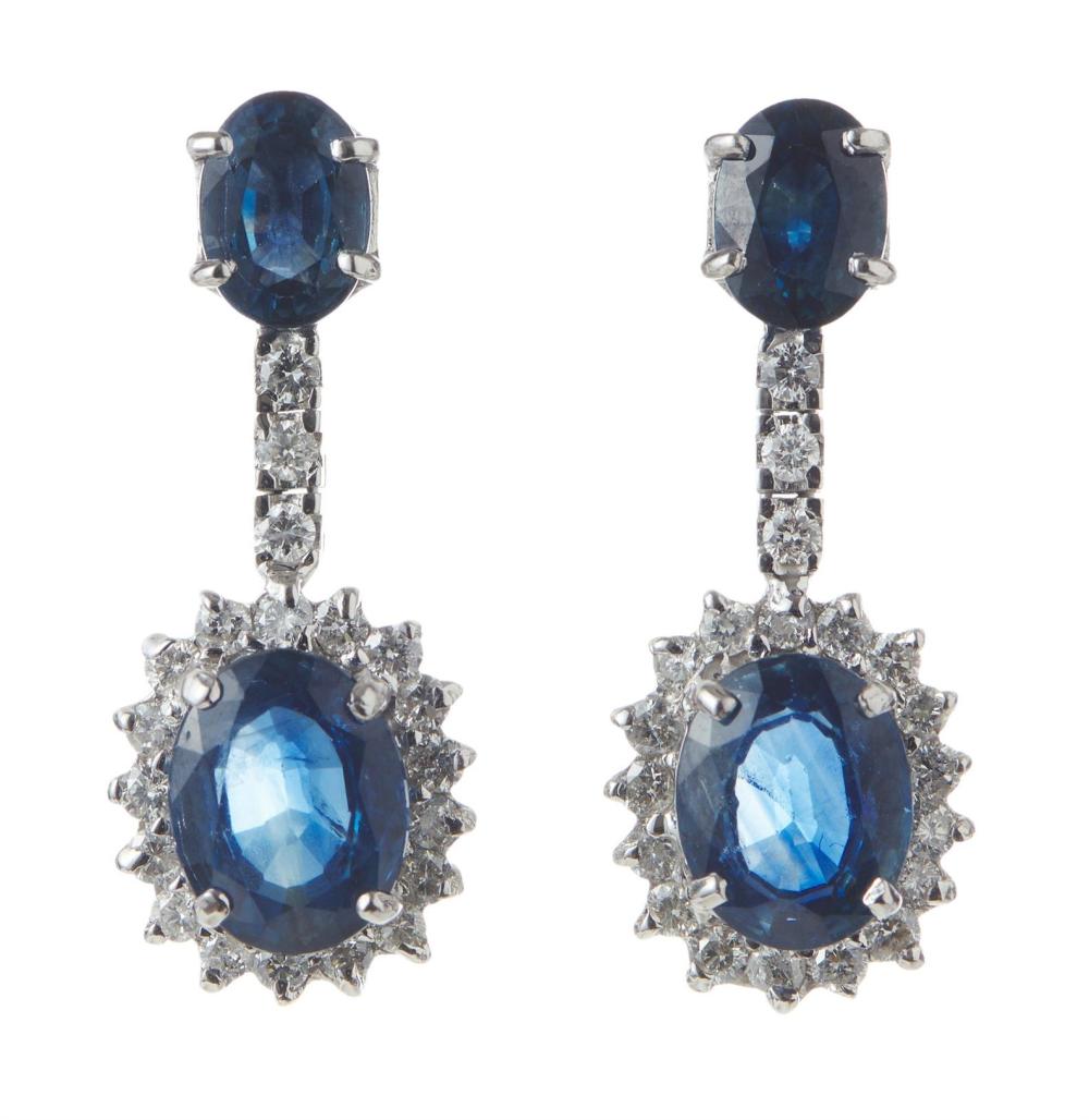 The earrings present in excellent, as new condition. Sapphires total 7.46cts (two total 5cts, one total 2.46cts) Diamonds total 0.92cts.