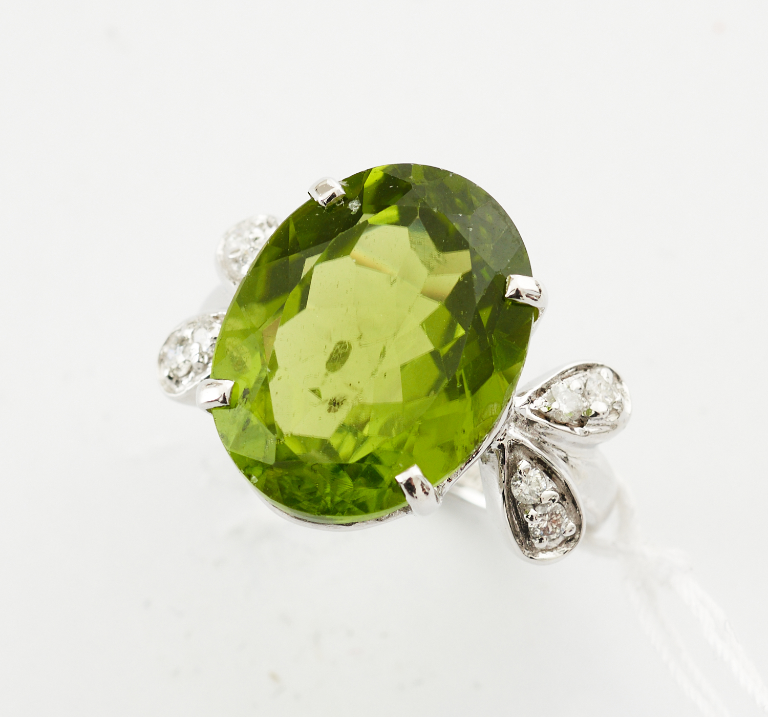 A PERIDOT AND DIAMOND RING Featuring an oval peridot weighing 11.60cts, flanked by decorative diamond set shoulders totalling 0.20cts, in 18ct white gold, ring size M.