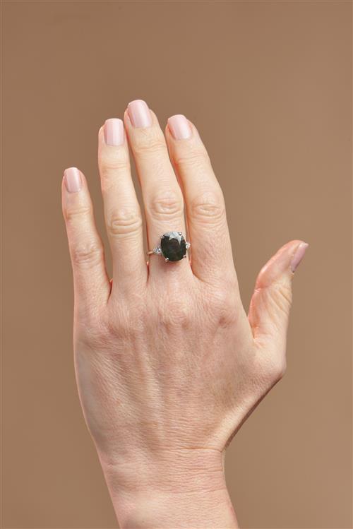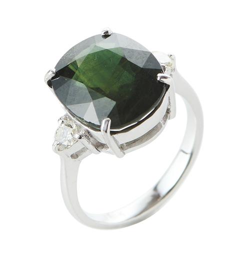 A GREEN SAPPHIRE AND DIAMOND RING IN 18CT WHITE GOLD, CENTRALLY SET WITH A CUSHION CUT GREEN SAPPHIRE OF 9.15CTS, SHOULDERED BY ROUND BRILLIANT CUT DIAMONDS TOTALLING 0.30CT, SIZE M-N, 6GMS