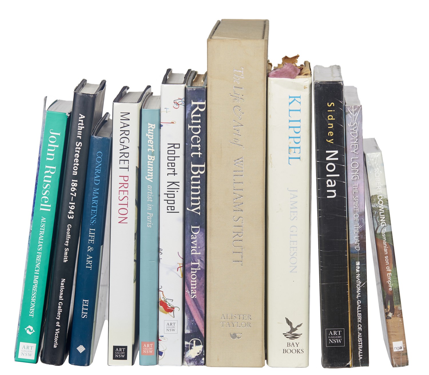 Including; Heather Curnow "The Life and Art of William Strutt"; Sidney Nolan Exhibition catalogue; Wayne Tunnicliffe ed. "John Russell Australia's French Impressionist"; Geoffrey Smith "Arthur Streeton 1867-1943"; James Gleeson "Robert Klippel"; and others (12).
