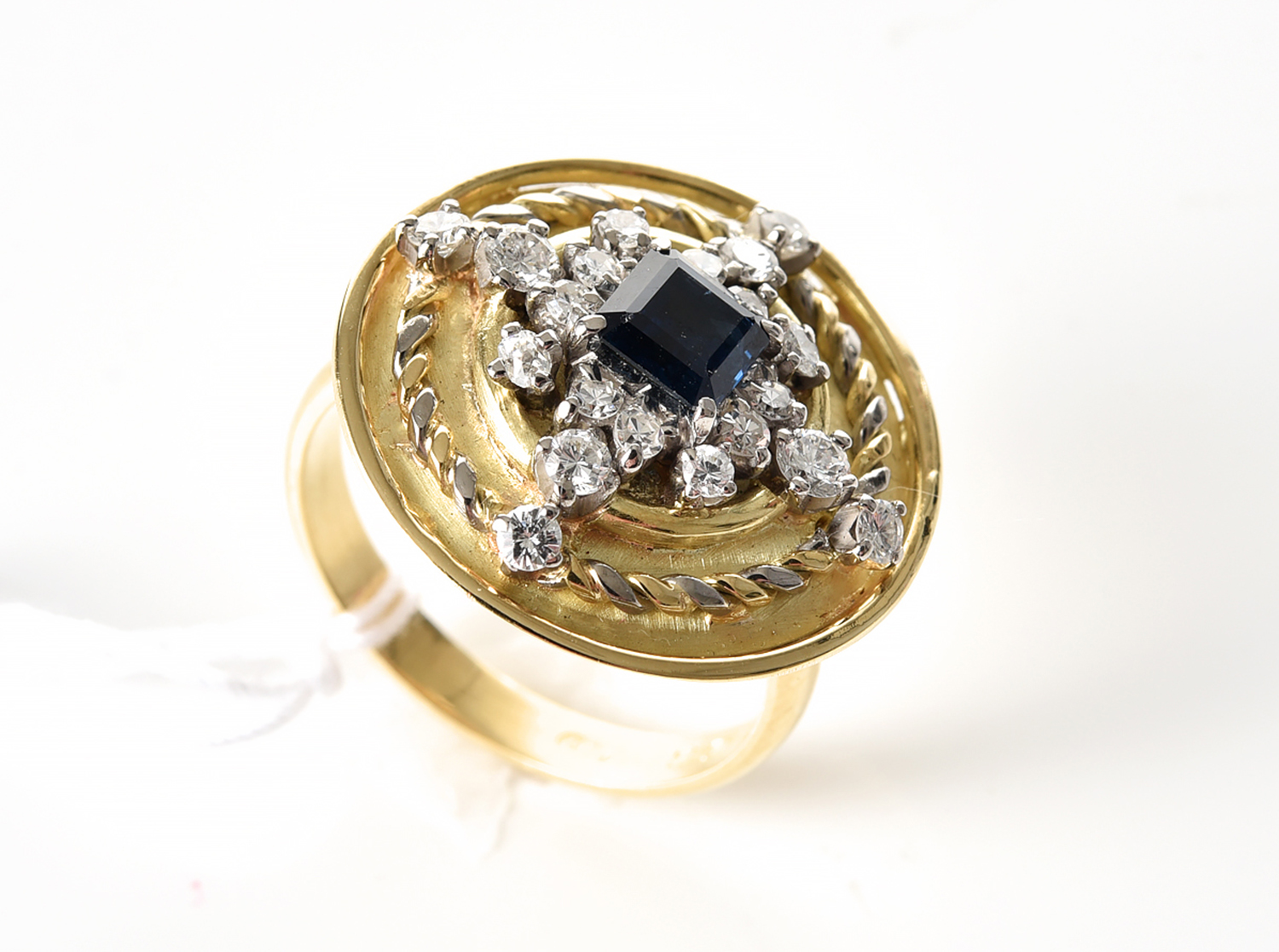 ALL STONES ARE SECURE IN THEIR SETTINGS. SAPPHIRE HAS A CHIP ON FACET JUNCTION NEAR TABLE, BAND SHOWS MINOR SIGNS OF WEAR. PLAQUE HAS A MINOR DENT AND IS NO LONGER PERFECTLY ROUND.
