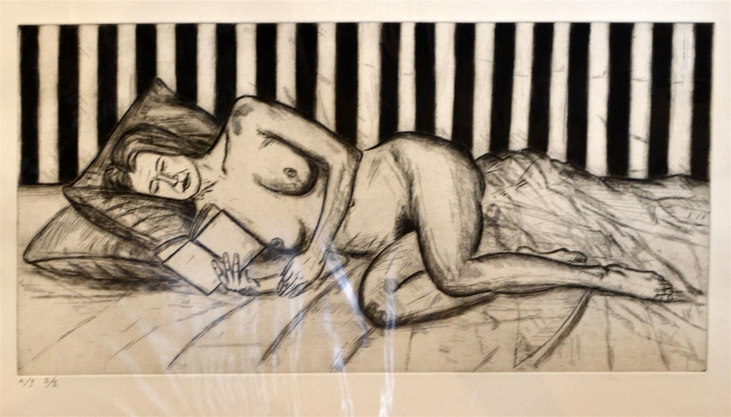 JEFF MAKIN, RECLINING NUDE READING, ETCHING A/P 2/2, UNSIGNED, 34 X 64CM, CONDITION: THIS WORK IS UNFRAMED BUT BACKED AND WRAPPED FOR PROTECTION, VERY GOOD, LEONARD DELIVERY SIZE: SMALL