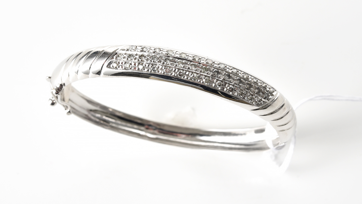 A DIAMOND HINGED BANGLE IN 14CT WHITE GOLD, INNER DIAMETER 55MM, 13.6GMS