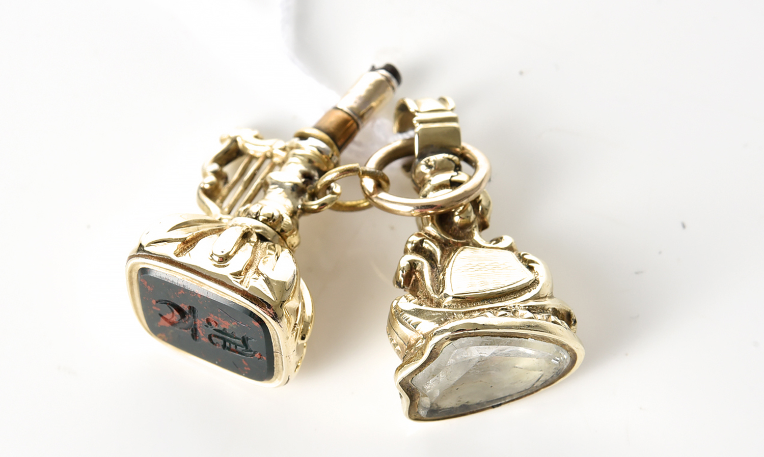 A GOLD CASED WATCH KEY SEAL FEATURING A HARP, CIRCA 1840, WITH A GOLD CASED SEAL PENDANT