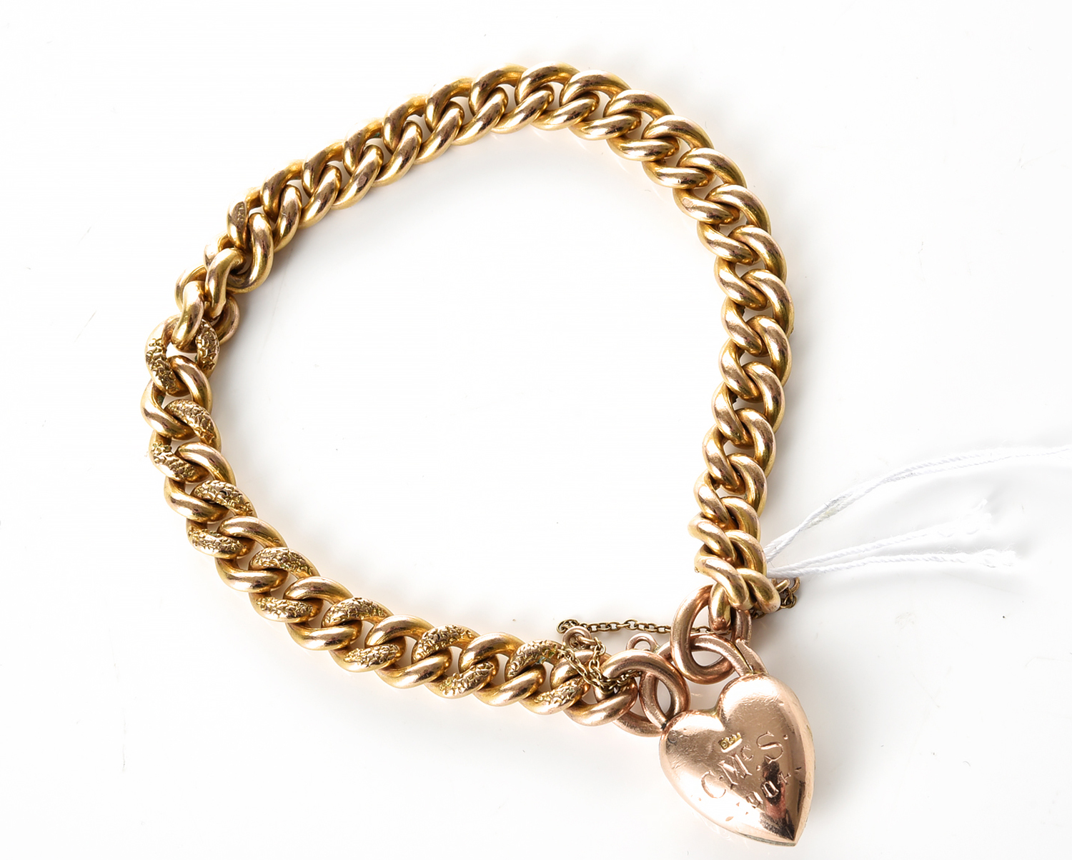 A CURB LINK BRACELET IN GILT, WITH A HEART PADLOCK DATED 1904, IN 9CT GOLD, WEIGHT OF THE PADLOCK 2.5GMS