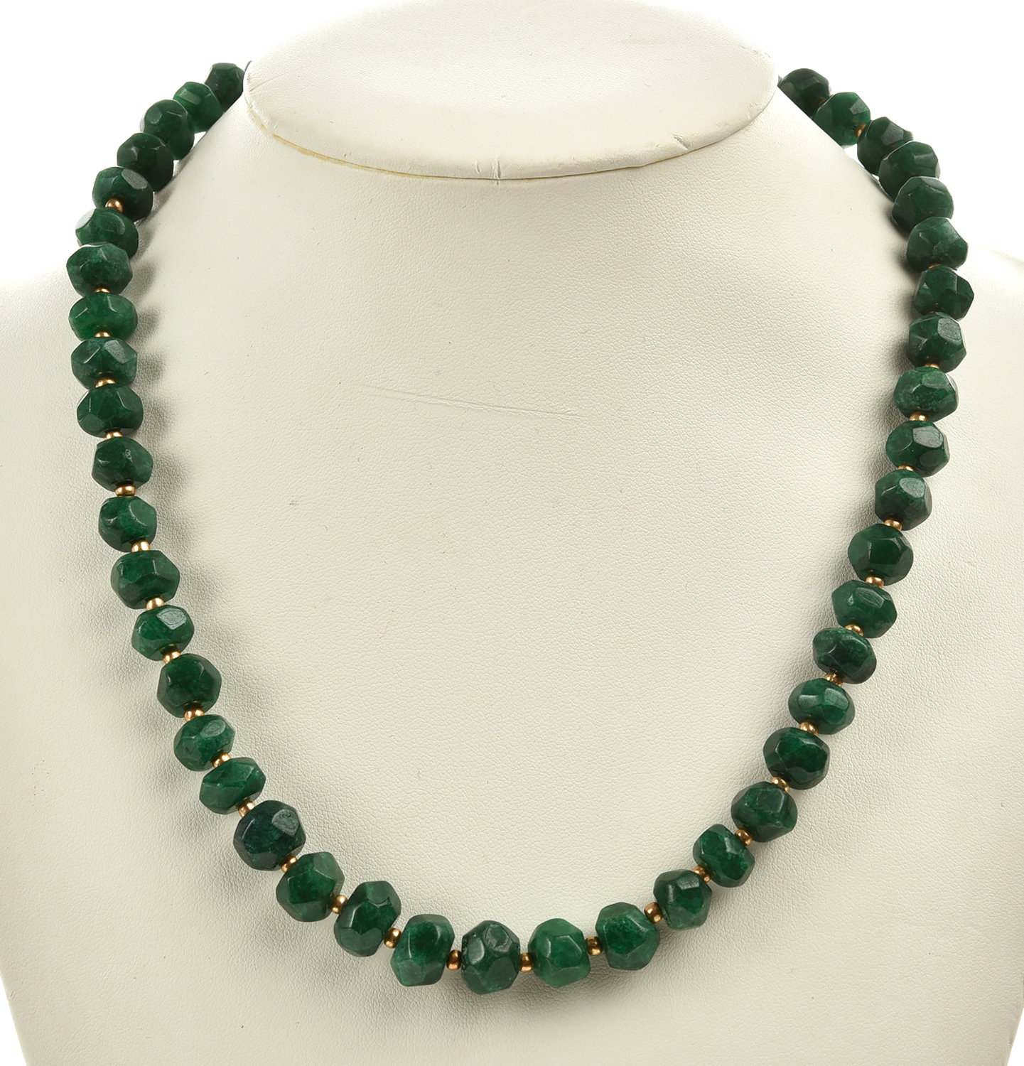 AN EMERALD TUMBLED BEAD NECKLACE, TOTAL LENGTH 490MM