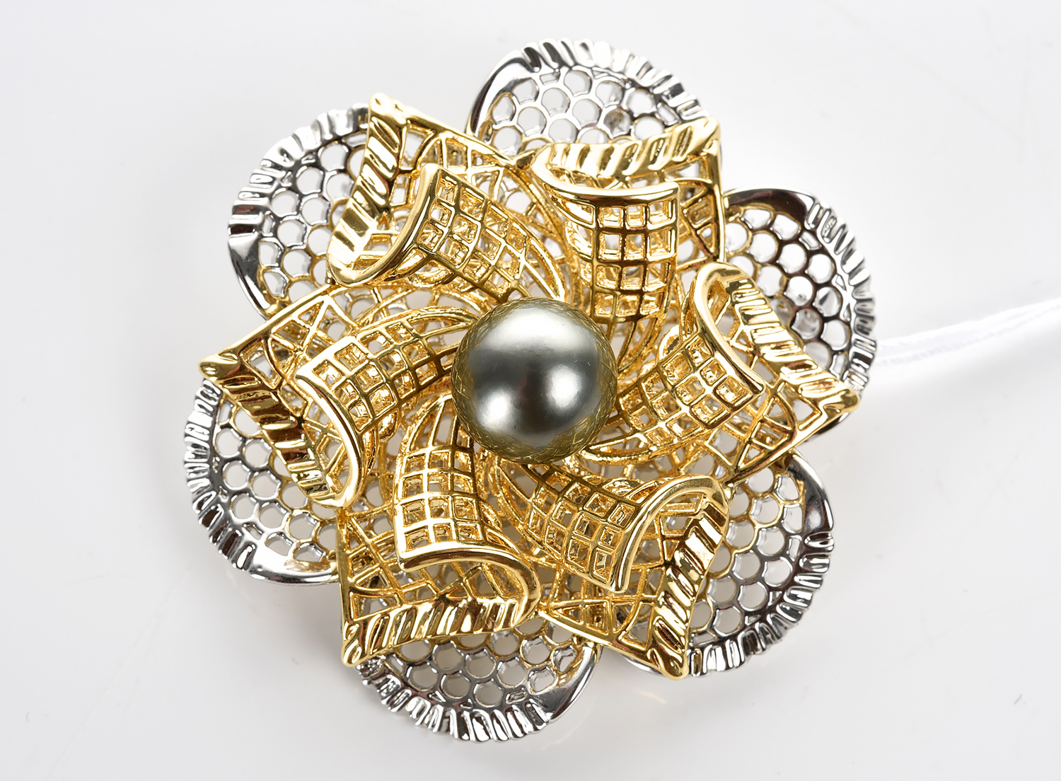 A TAHITIAN PEARL BROOCH IN STERLING SILVER AND SILVER GILT, LENGTH 50MM