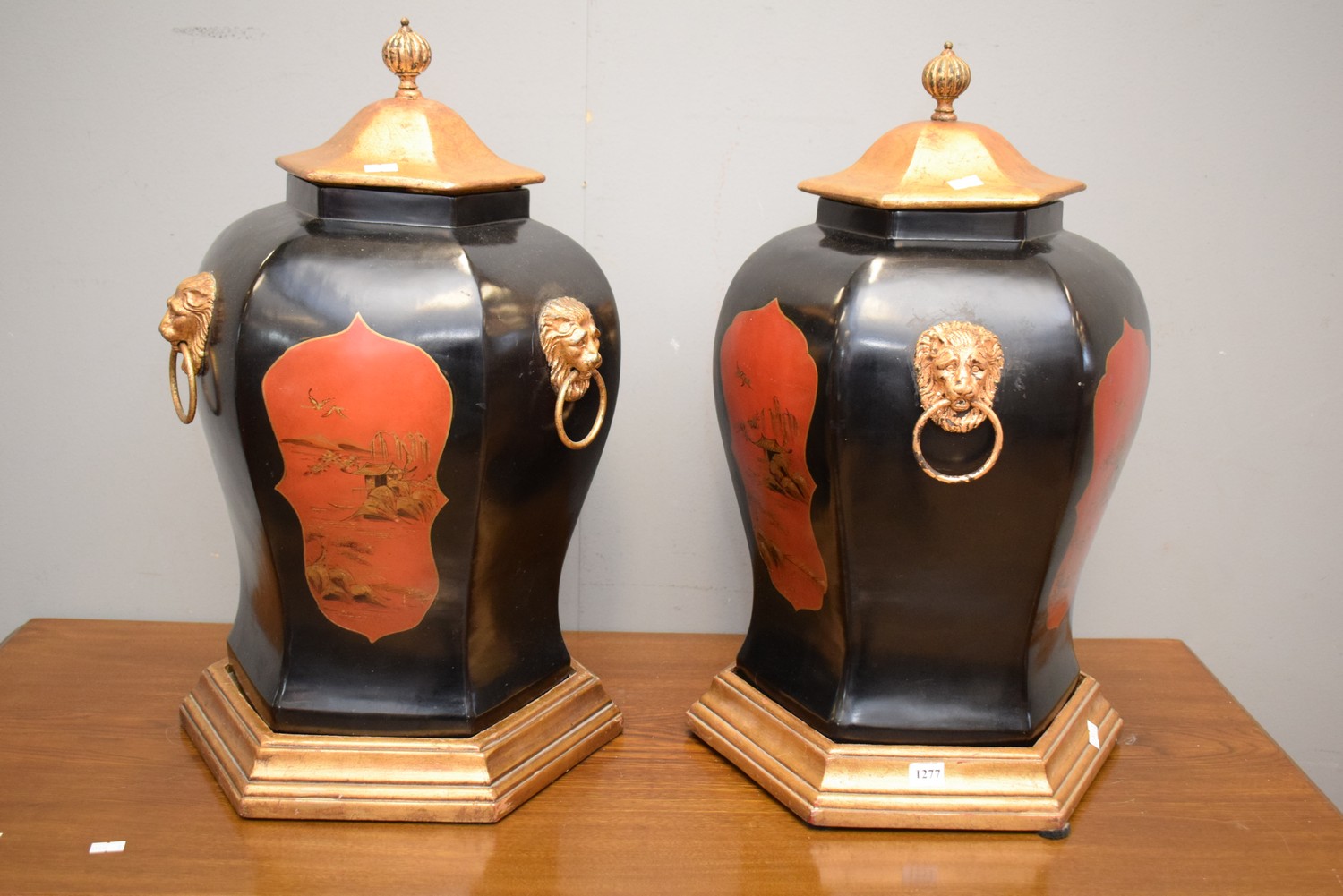 TWO CHINOISERIE STYLE URNS ON STANDS (OVERALL HEIGHT 55CM)