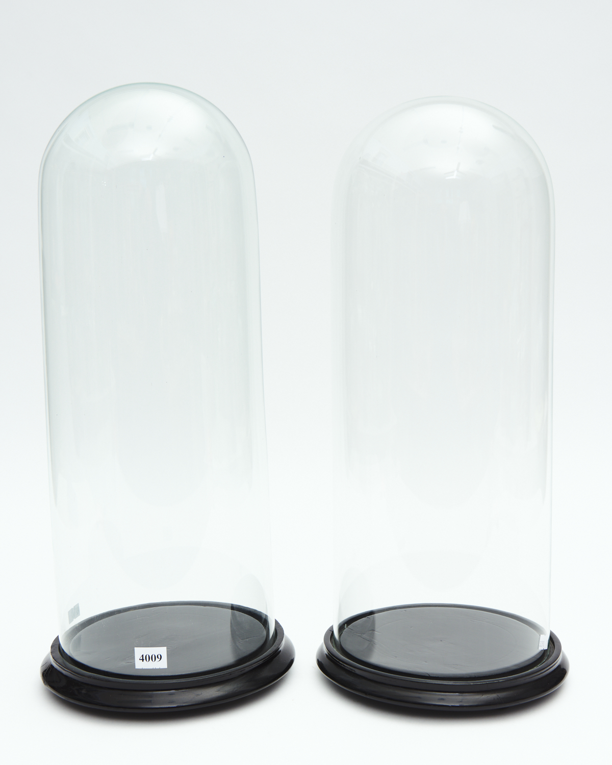 A PAIR OF GLASS DOMES WITH EBONISED BASES, 49 CM HIGH OVERALL