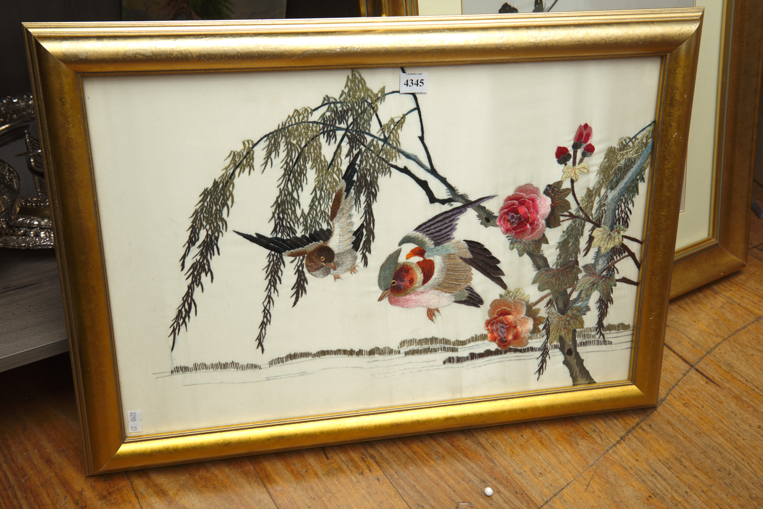 A CONTEMPORARY GILT FRAMED ORIENTAL EMBROIDERY WITH BIRD AND FLORAL SCENE