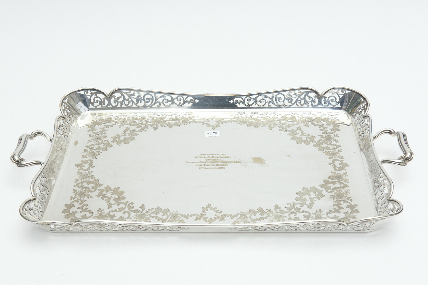 AN ENGLISH SILVERPLATED TWO HANDLED GALLERY TRAY WITH INSCRIPTION ECHUCA BOWLING CRICKET GOLF AND TENNIS CLUBS, 63 CM WIDE ACROSS THE HANDLES