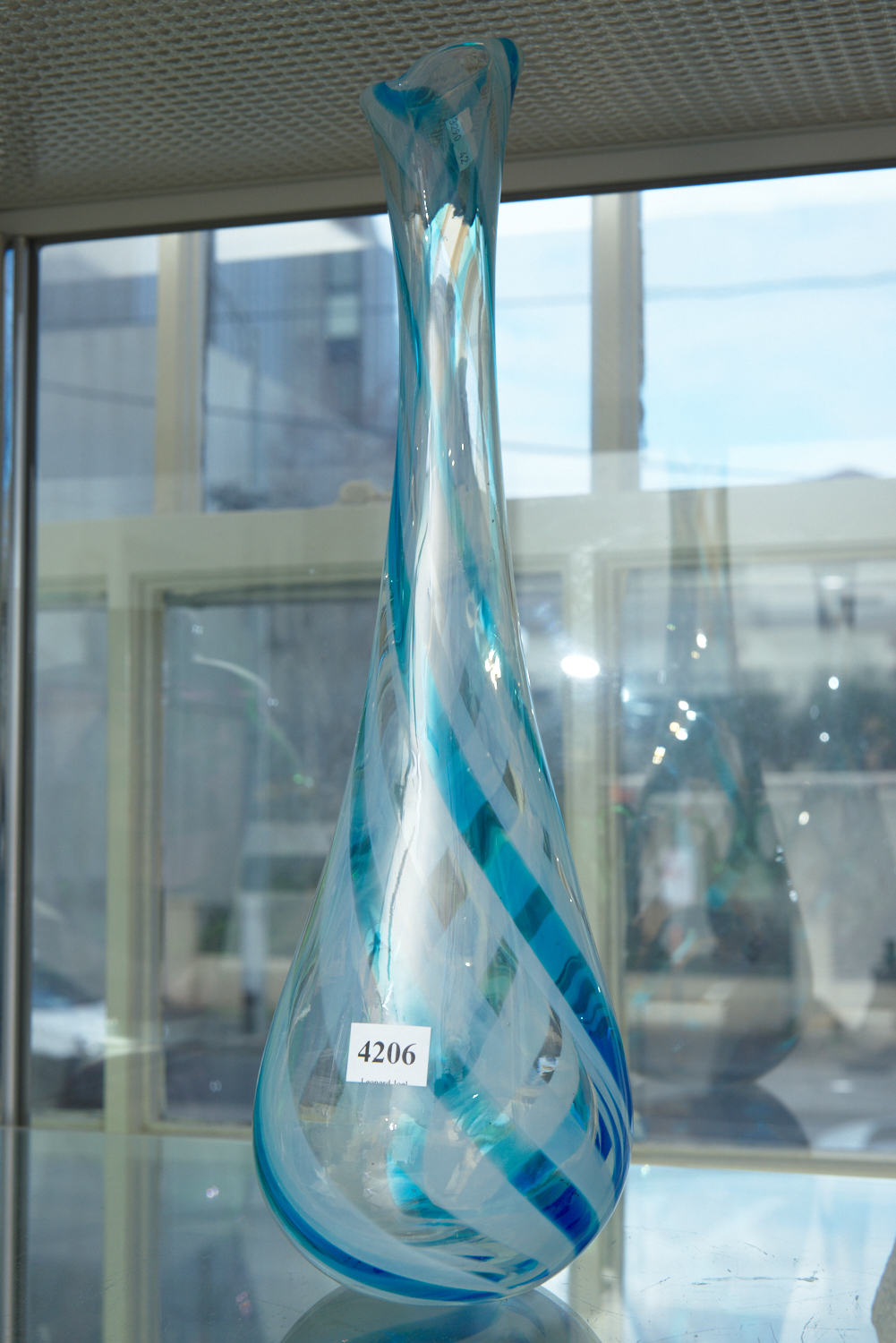A 1950S ITALIAN BLUE WHITE AND CLEAR TWIST GLASS VASE, 40 CM HIGH
