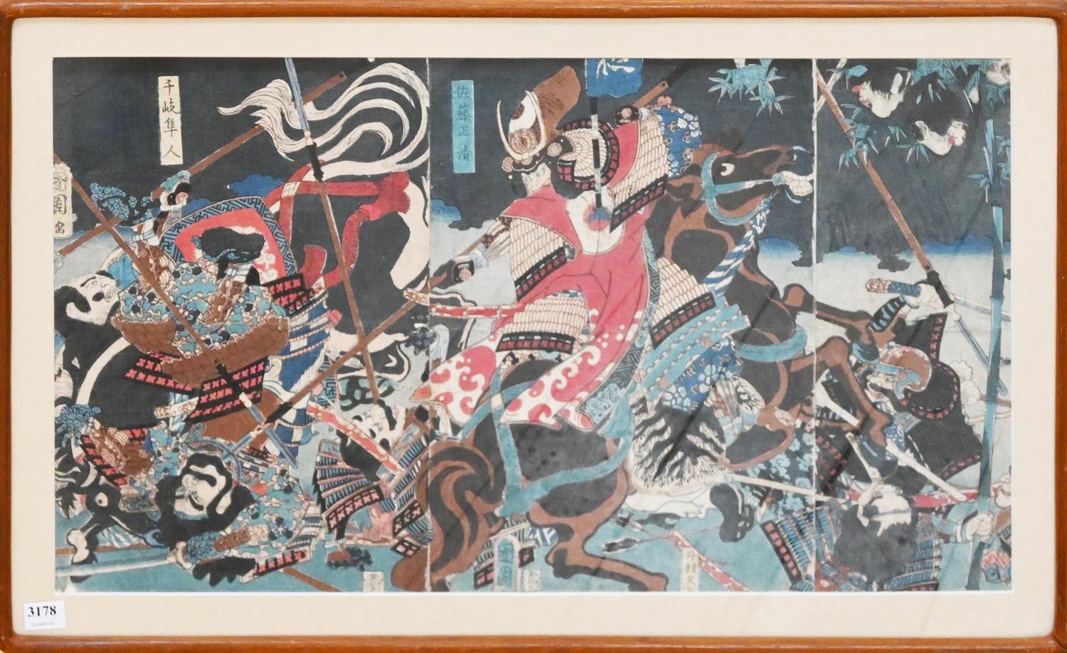 KUNICHICKA, BATTLE, JAPANESE WOODBLOCK PRINT, TRIPTYCH, 34 X 60.5CM FRAME SIZE: 43 X 69CM