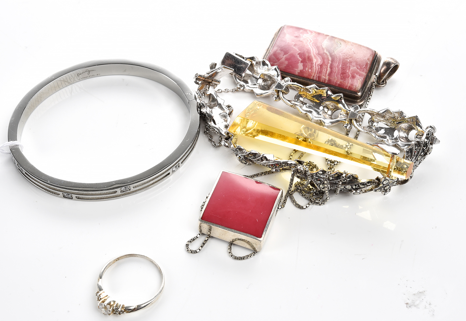 A COLLECTION OF COSTUME AND VINTAGE JEWELLERY COMPRISING A BANGLE IN STAINLESS STEEL, PENDANTS, CHAIN, MARCASITE BRACELET, RING