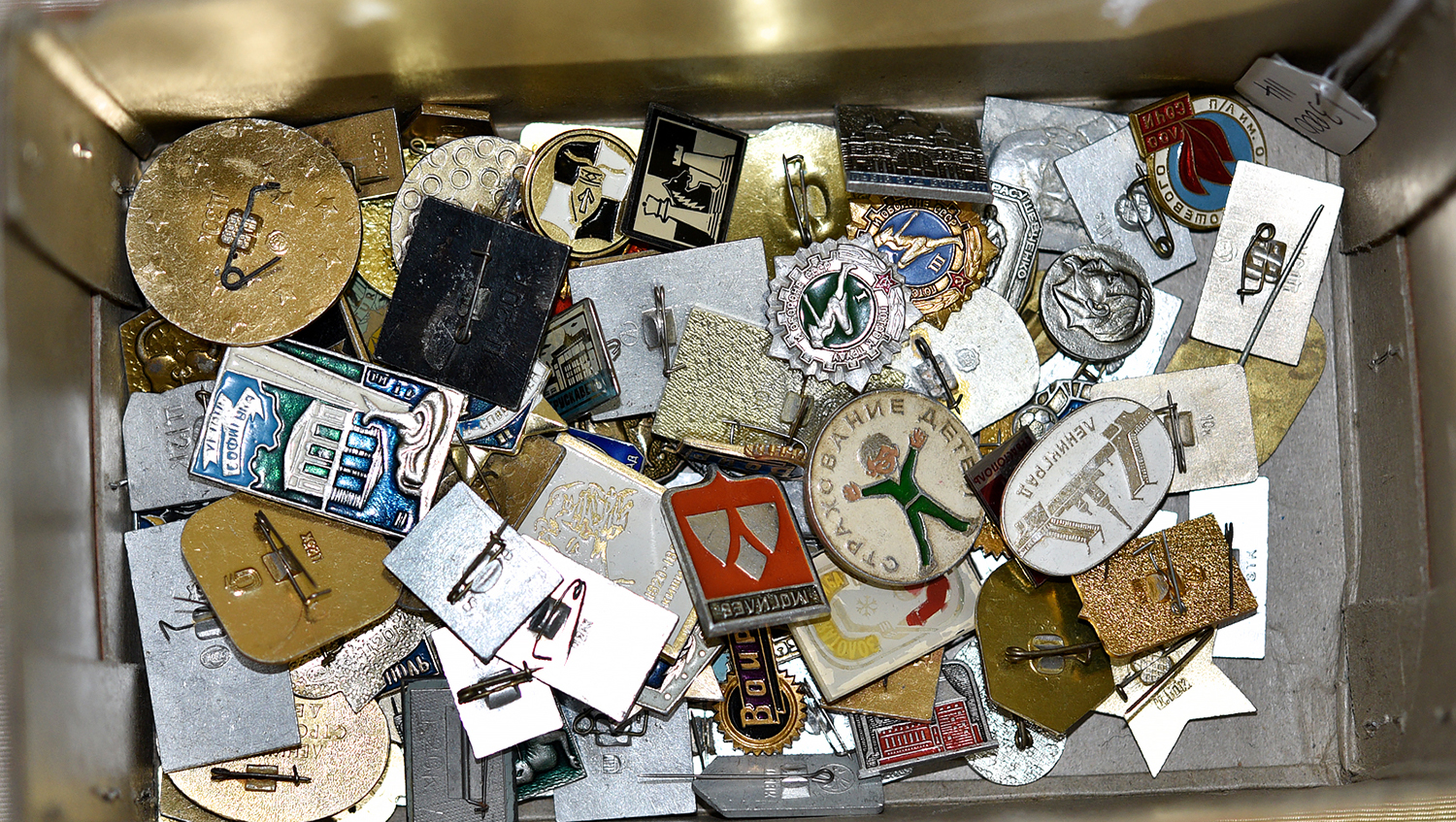 A VINTAGE JEWELLERY BOX FROM DUNKLINGS THE JEWELLERS, COMPRISING A LARGE COLLECTION OF VINTAGE PINS AND BADGES (MOSTLY RUSSIAN/USSR)