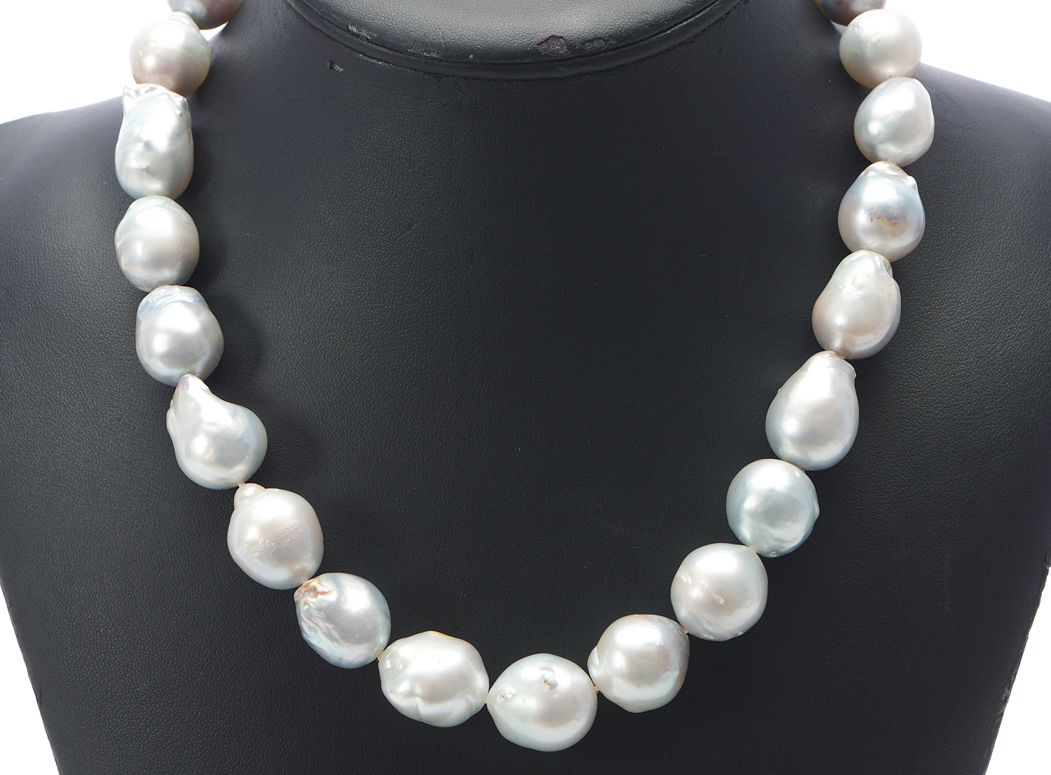 Pearls present a good lustre with visible natural blemishes to skin; silver-white hues.