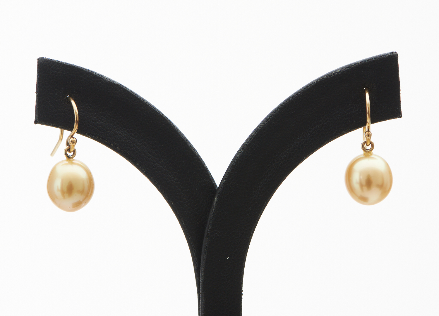 A PAIR OF GOLDEN SOUTH SEA PEARL EARRINGS IN 18CT GOLD, THE NEAR ROUND PEARLS MEASURING 9.8MM, TO SHEPHERD HOOK FITTINGS, LENGTH 240MM