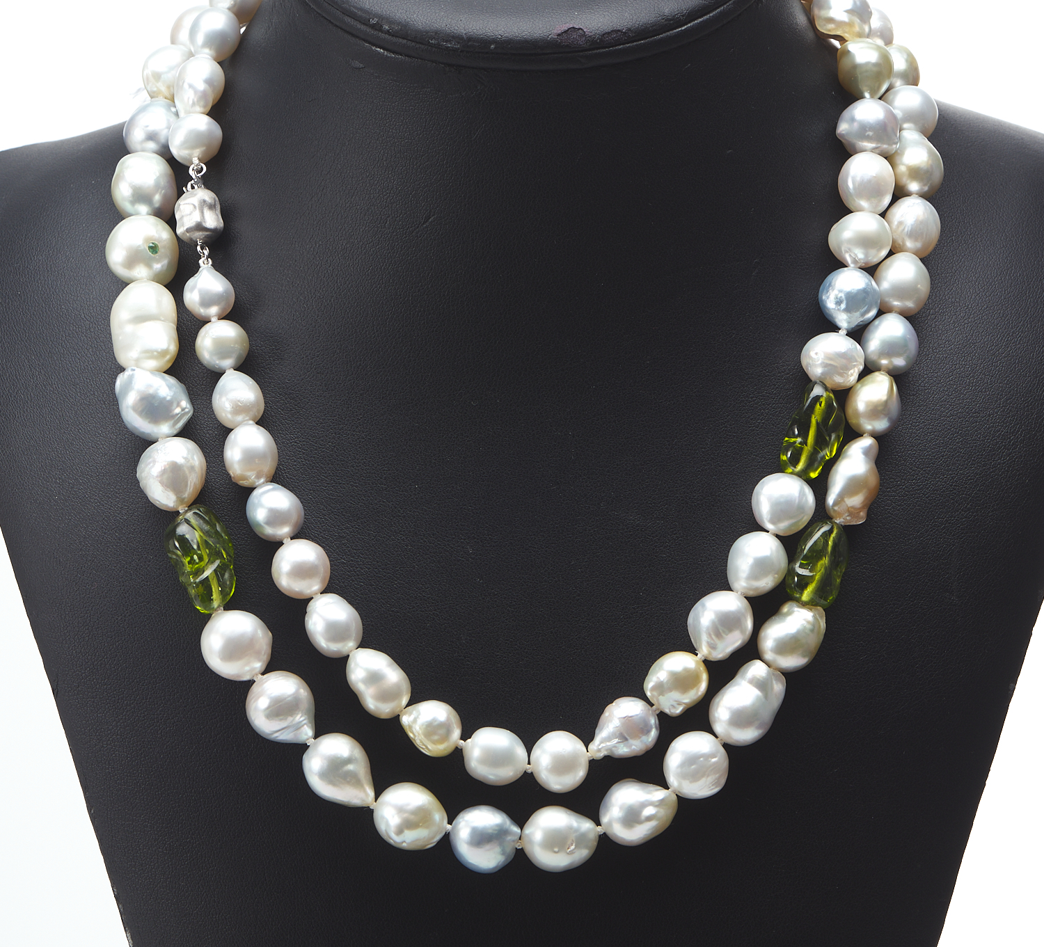 AN OPERA LENGTH STRAND OF SOUTH SEA PEARLS SPACED WITH TUMBLED PERIDOT BEADS, TO A FREEFORM CLASP IN 18CT WHITE GOLD