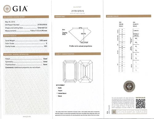 Accompanied by a GIA report numbered 2175137515, dated 5 May 2015, stating that the 3.02 carat diamond is E colour, VS1 clarity.