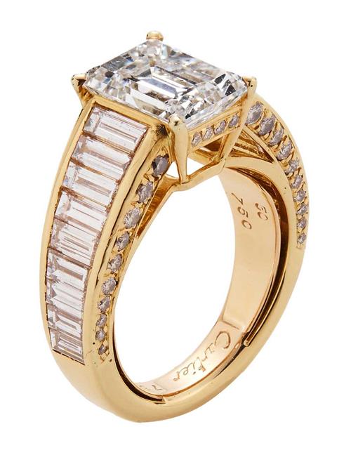 The emerald-cut diamond weighing 3.02 carats is claw-set between graduated baguette and brilliant-cut diamond-set shoulders, the small diamonds together weighing approximately 3.40 carats, size 50 (K1/2), signed Cartier, numbered.
