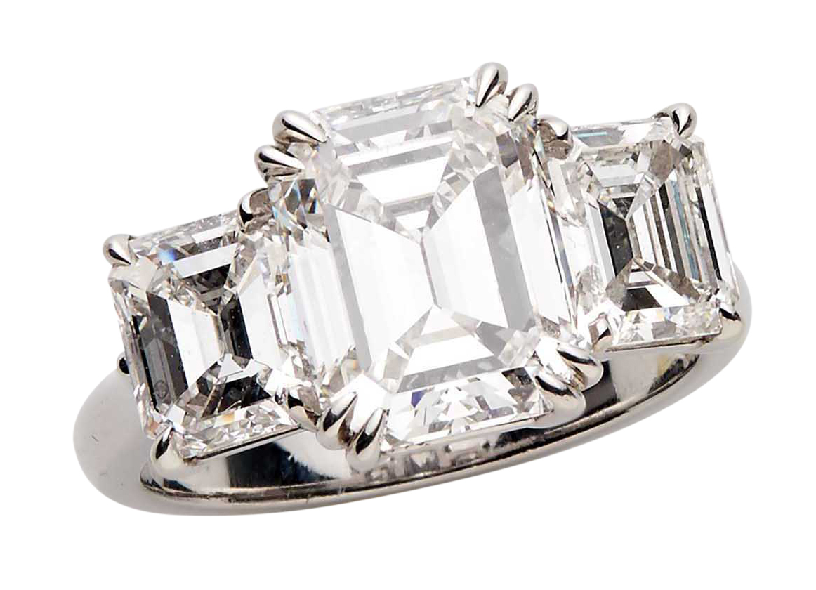 The three-stone diamond ring is claw-set to the centre with an emerald-cut diamond weighing 4.26 carats, between a pair of similarly cut diamonds weighing 1.24 and 1.21 carats respectively, size N, maker's mark HW for Harry Winston.
