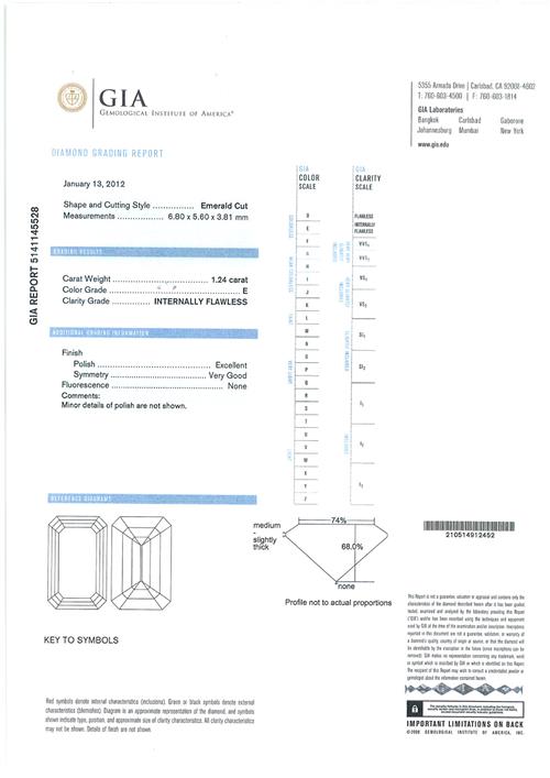 a GIA report numbered 5141145528, dated 13 January 2012, stating that the 1.24 carat diamond is E colour, internally flawless clarity;