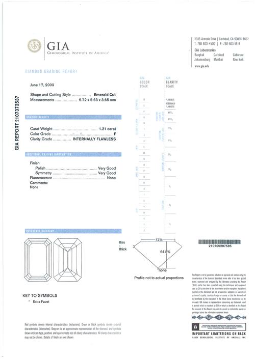 a GIA report numbered 2107373537, dated 17 June 2009, stating that the 1.21 carat diamond are F colour, internally flawless clarity.