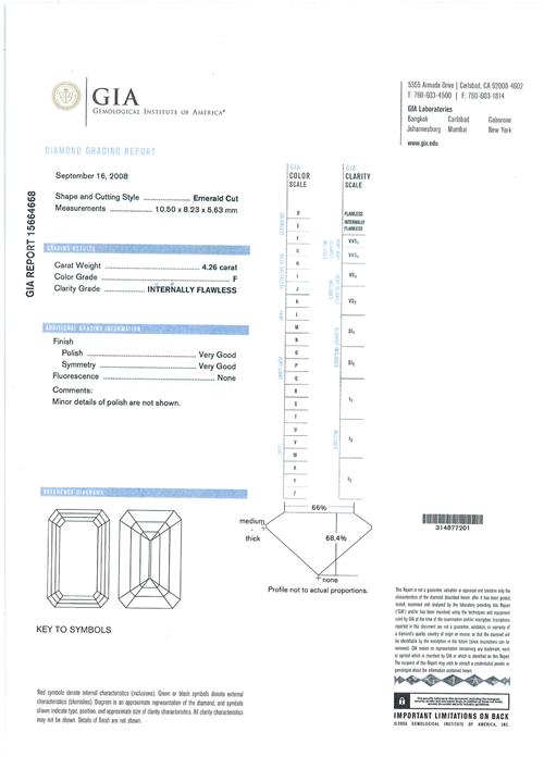 a GIA report numbered 15664668, dated 16 September 2008, stating that the 4.26 carat diamond is F colour, internally flawless clarity;