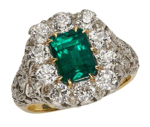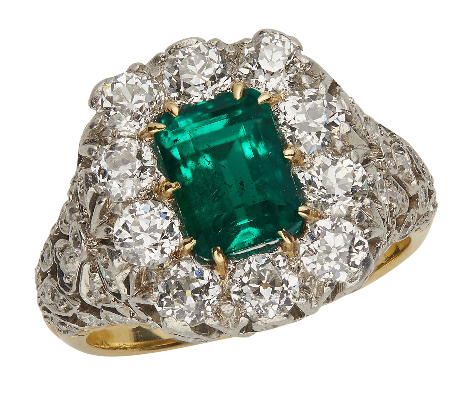 Of cluster design, centring on a claw-set rectangular modified emerald-cut emerald weighing 1.93 carats, framed by a line of old mine-cut diamonds, the gallery and shoulders decorated in foliate motifs embellished with old-cut diamonds, size O.