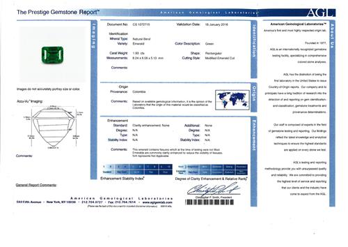 Accompanied by an AGL report numbered CS 1072715, dated 18 January 2016, stating that the 1.93 carat emerald is natural, with no indications of clarity enhancement, of Columbian origin.