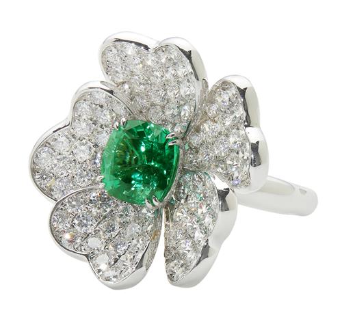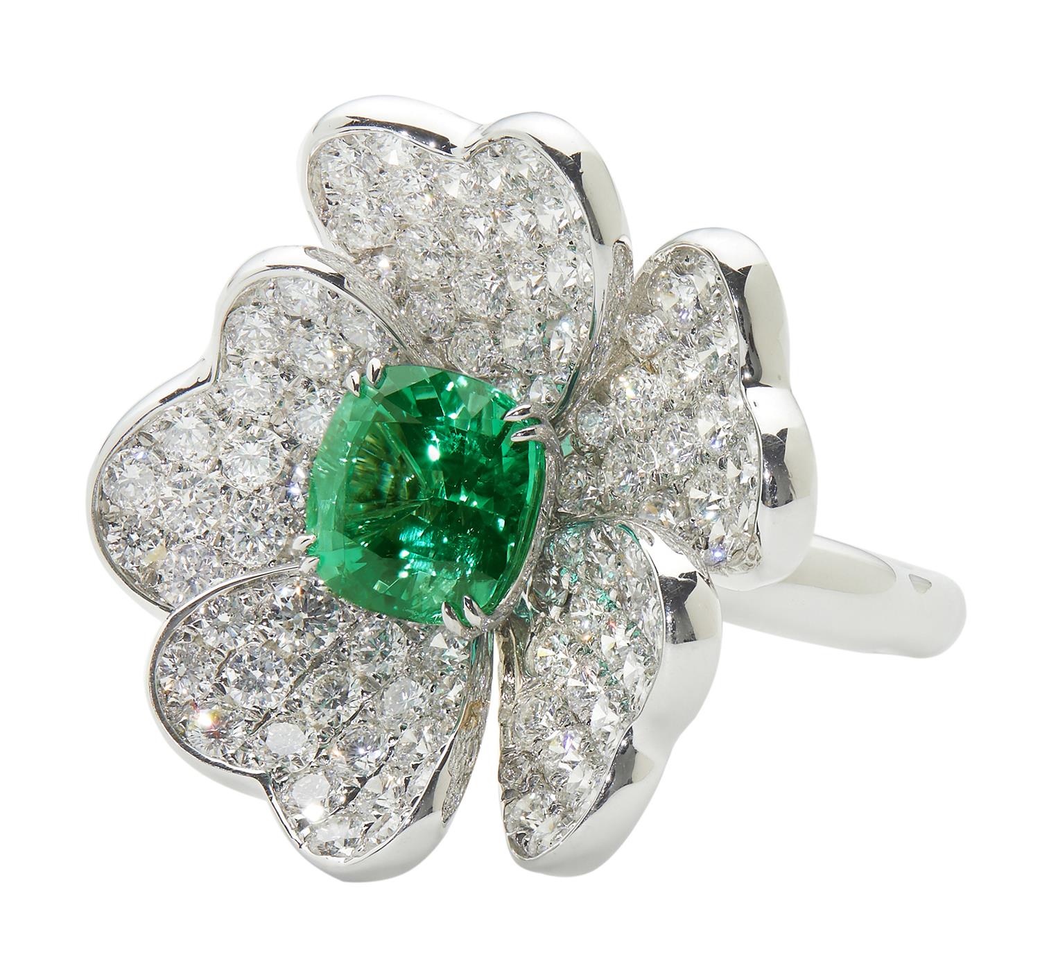 Of flower head design, centring a claw-set cushion-shaped Australian emerald weighing 2.14 carats, the five surrounding petals pavé-set with brilliant-cut diamonds, the diamonds together stated to weigh 3.29 carats, size L1/2.