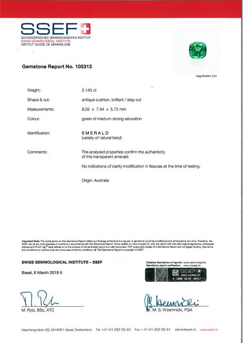 Accompanied by a SSEF report numbered 105313, dated 6 March 2019, stating that the 2.14 carat emerald is natural, with no indications of clarity enhancement, of Australian origin.