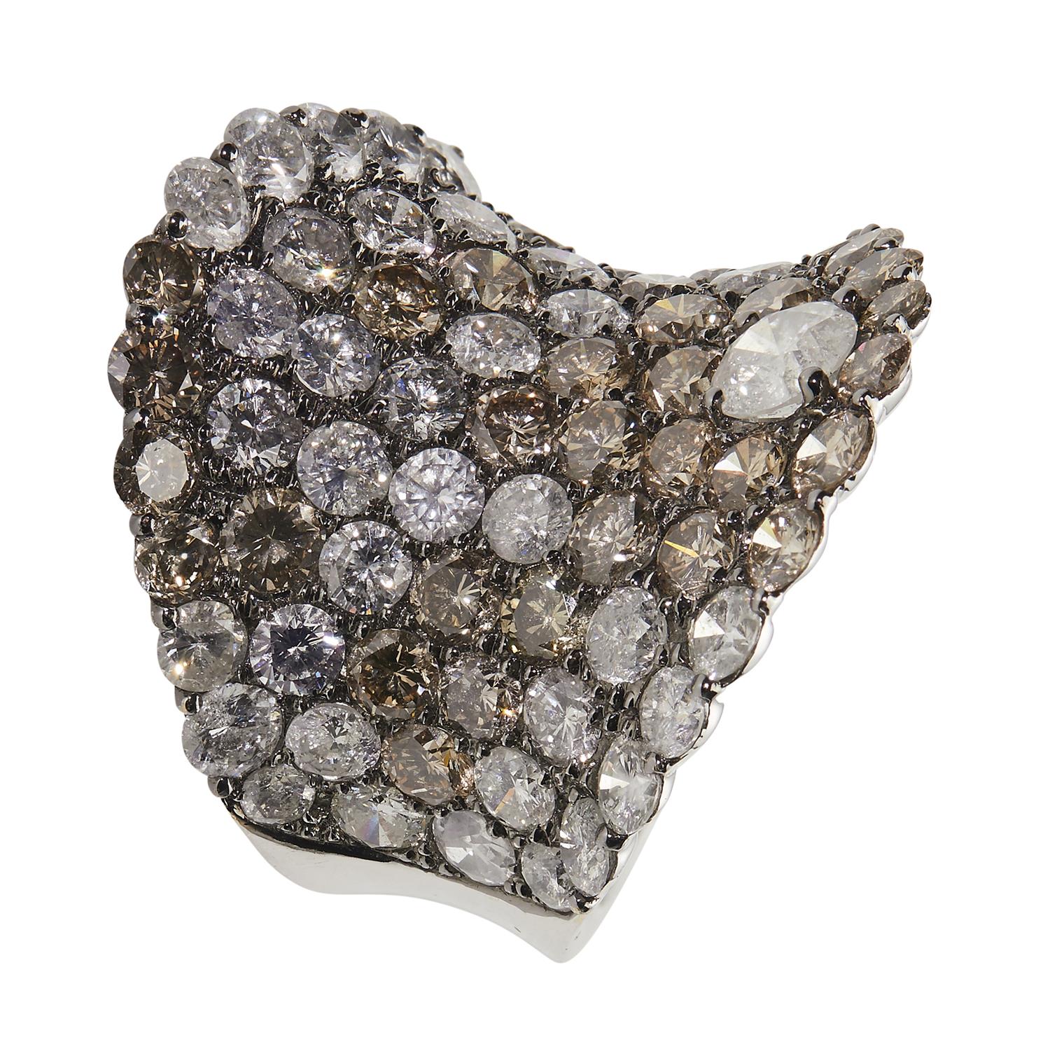 Modelled as a 25mm concave plaque pavé-set to the front with natural fancy brown and near colourless brilliant-cut diamonds, the diamonds together weighing approximately 9.07 carats, size N.