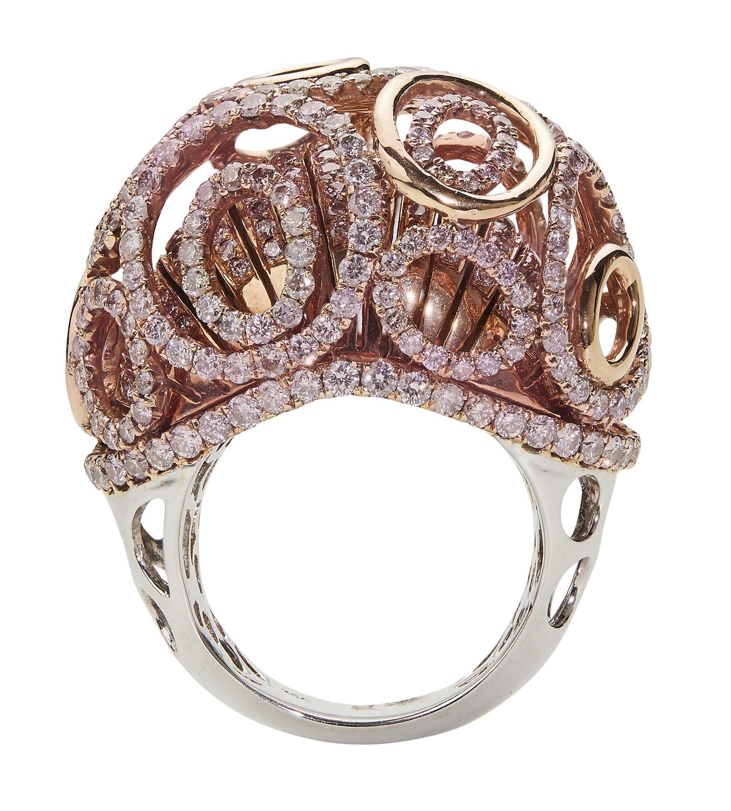 Of bombé design centring a line of openwork scrolls pavé-set with natural light fancy pink brilliant-cut diamonds, surmounted by an openwork geometric motif decorated at intervals with brilliant-cut diamonds together weighing 5.12 carats, size L1/2.