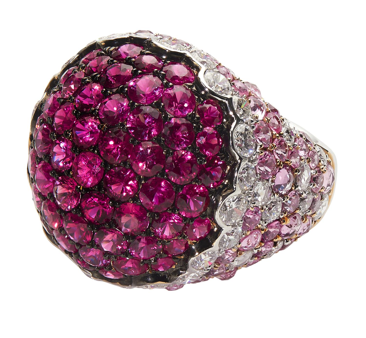 Of bombé design, the top pavé-set with circular-cut rubies above shoulders, similarly set with pink sapphires and diamond, between a scalloped edge decorated with diamonds, size N.