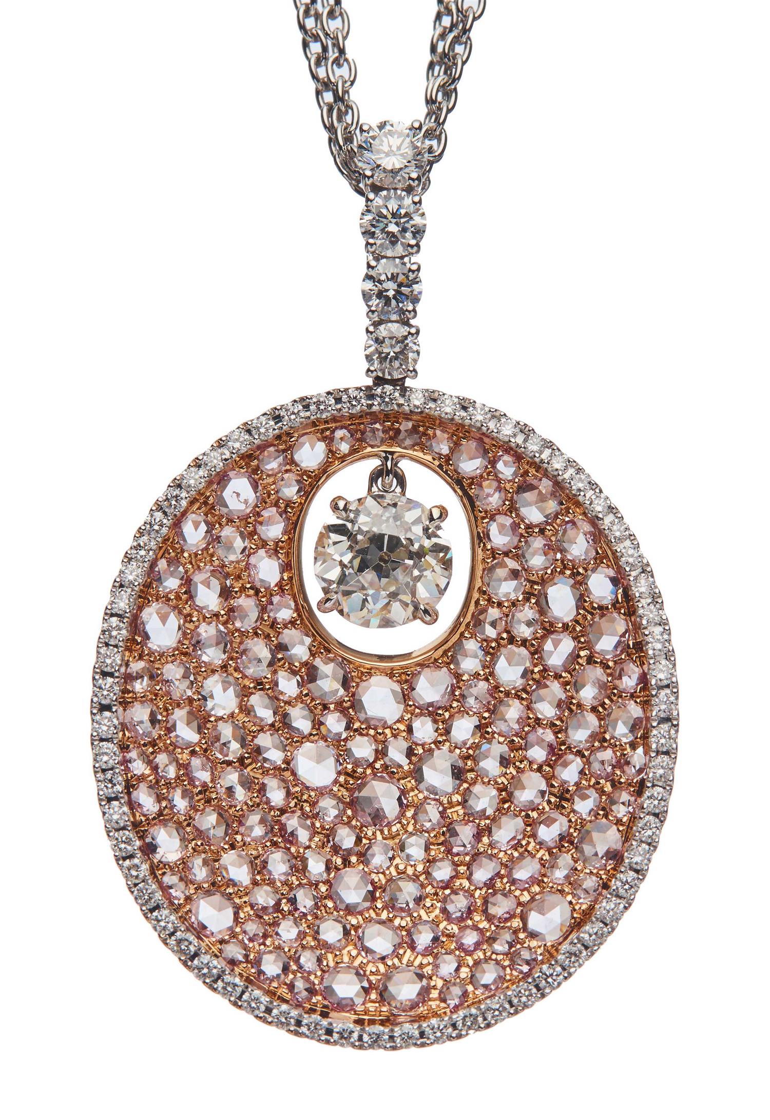 Modelled as a concave oval plaque decorated with Argyle light fancy pink to fancy pink rose diamonds framed by pavé-set near colourless brilliant-cut diamonds, the top centring an openwork swing drop claw-set with an old European-cut diamond weighing 1.08 carats, supported from a double row trace chain embellished at intervals with spectacle-set brilliant-cut diamonds between a surmount set with similarly-cut diamonds, the diamonds together weighing approximately 3.11 carats, pendant length approximately 42.5mm, chain circumference approximately 450mm.