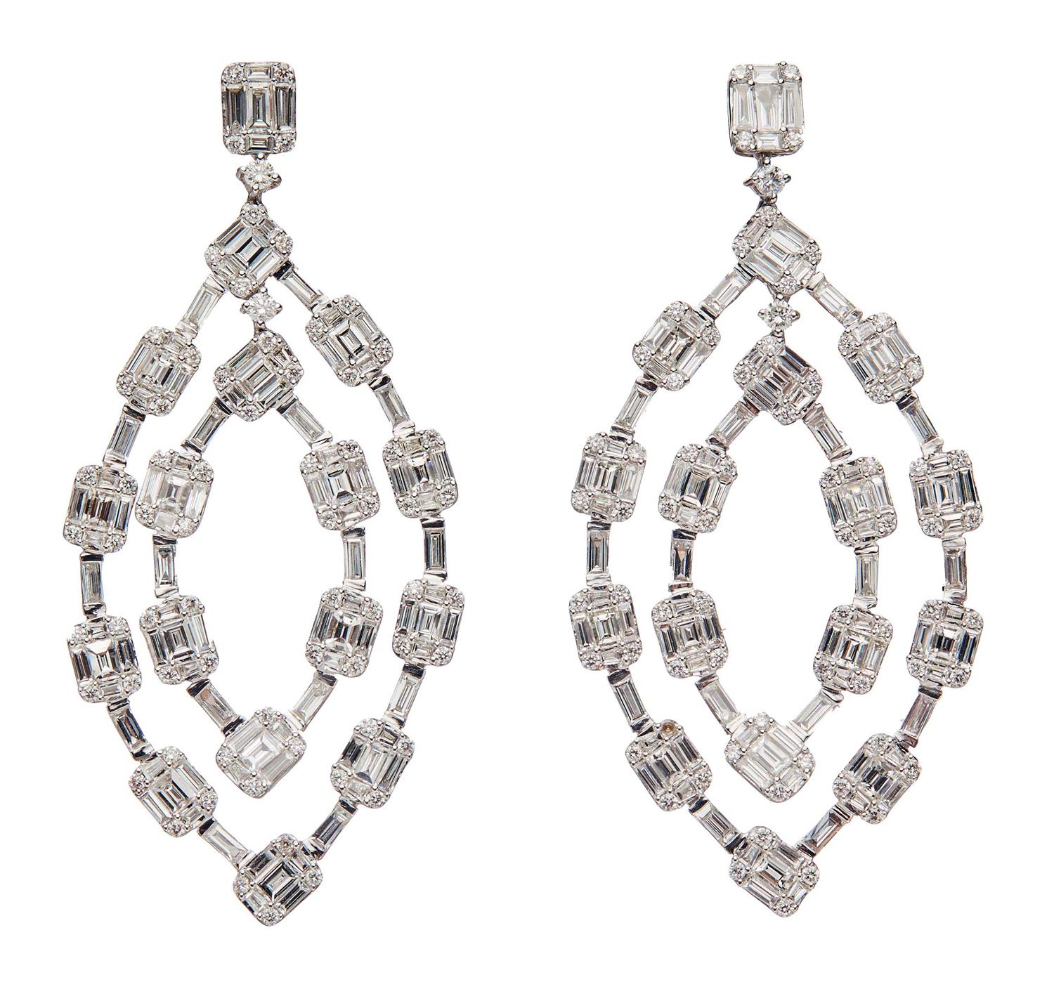 Each surmount modelled as a cluster of baguette and brilliant-cut diamonds supporting a pair of openwork elliptical hoops decorated with similarly set clusters between baguette diamond spacers, the diamonds together weighing approximately 4.72 carats, length approximately 52mm, post and scroll fittings.