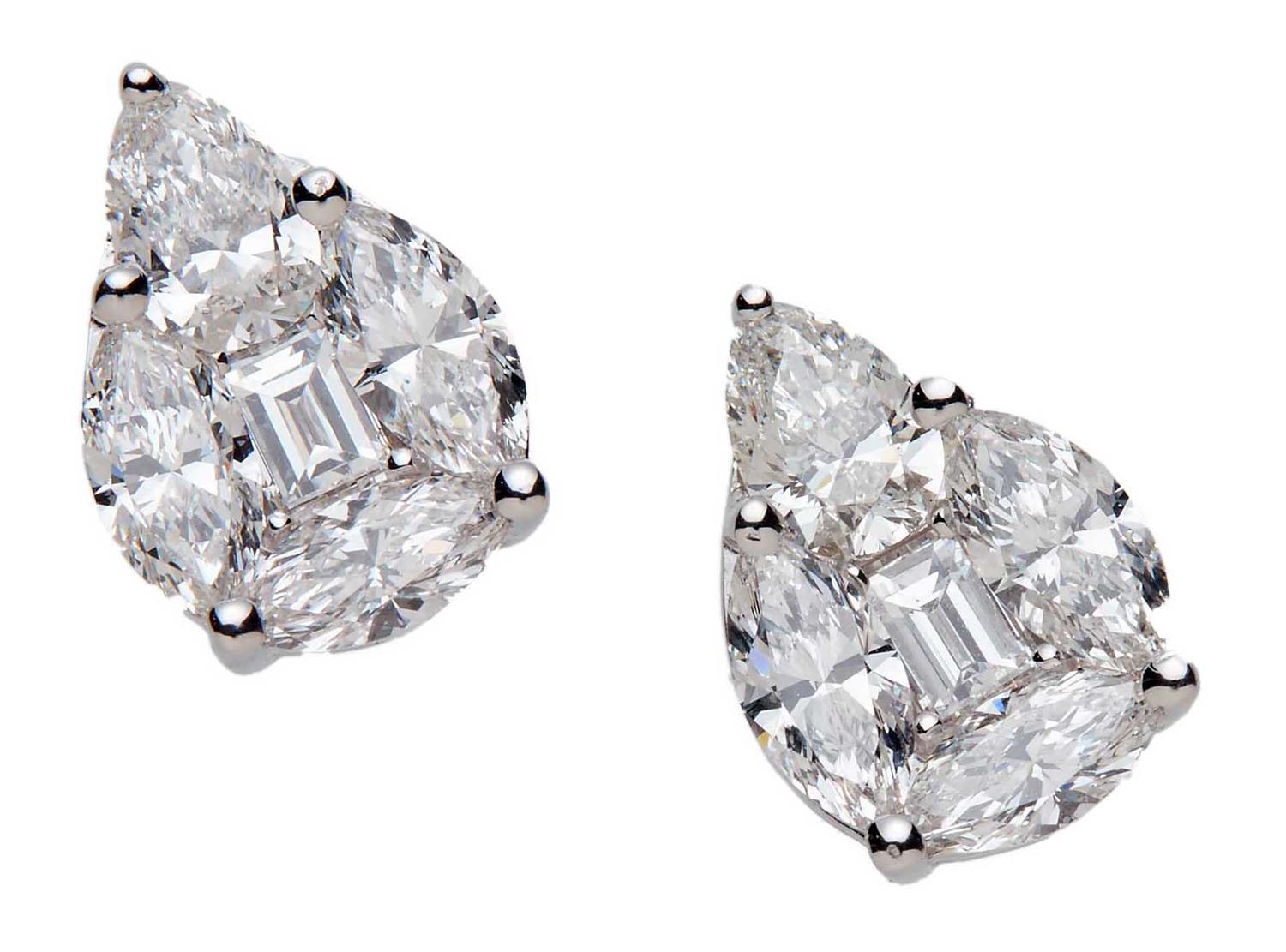 Modelled as a pear-shaped cluster, centring a claw-set emerald-cut diamond, framed by pear and marquise-shaped diamonds together stated to weigh 2.89 carats, length approximately 13mm, post and scroll fitting.