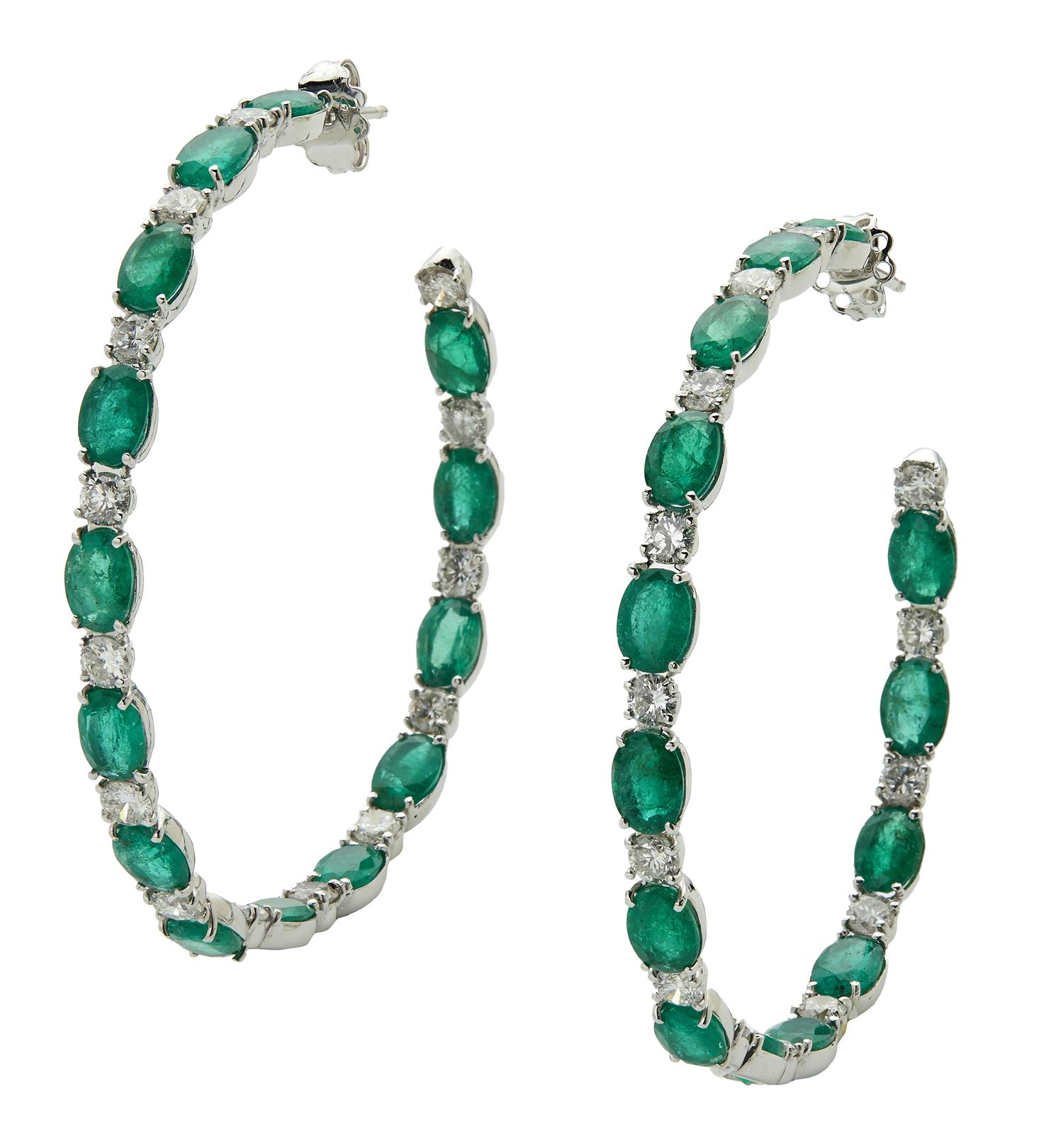 Each circular hoop claw-set to the front and inside back with a line of oval emeralds alternating between a brilliant-cut diamond spacer, the emeralds and diamonds together weighing approximately 20.01 carats and 5.61 carats respectively, diameter approximately 55mm, post and scroll fittings.