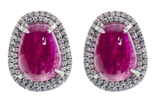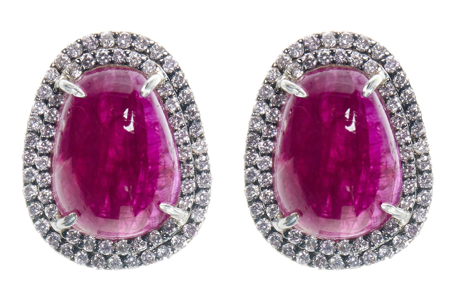 Each of cluster design, centring a claw-set pear-shaped cabochon Burmese ruby, framed by a double line of brilliant-cut diamonds, the rubies and diamonds together weighing 16.56 carats and 1.25 carats respectively, approximately 18 x 15mm, post and clip fittings.