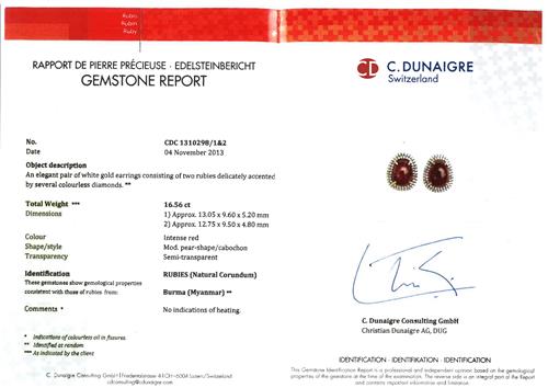 Accompanied by a C. Dunaigre report numbered CDC 1310298/1&2, dated 4 November 2013, stating that the 16.56 carat rubies are intense red, with no indications of heating, of Burma (Myanmar) origin.