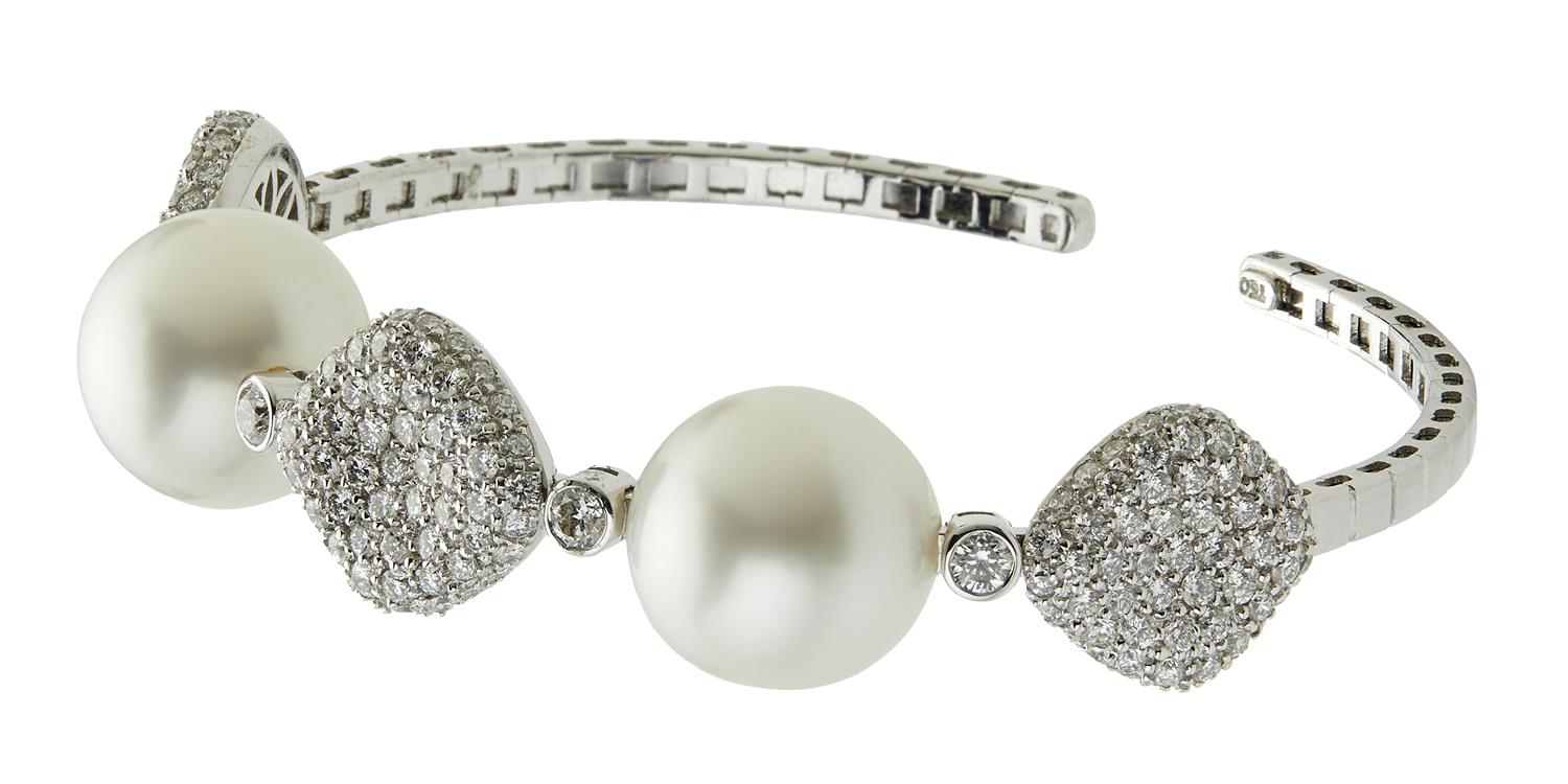 18CT WHITE GOLD, DIAMOND AND SOUTH SEA PEARL BANGLE