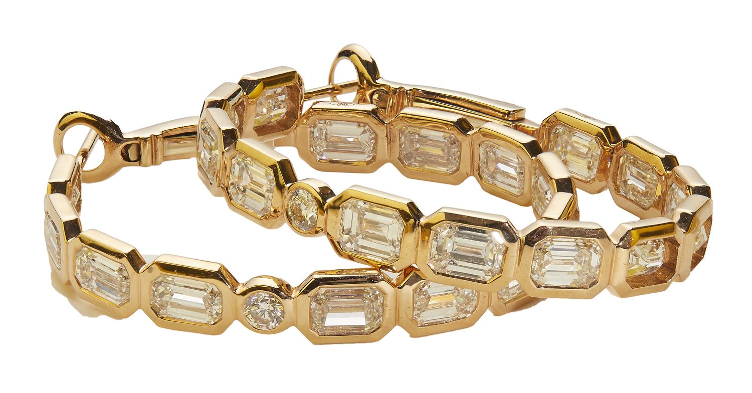 Each elliptical hoop set to the front and inside back with a line of emerald-cut diamonds between a brilliant-cut diamond spacer, the diamonds together weighing approximately 9.42 carats, length approximately 37mm, post and clip fittings.