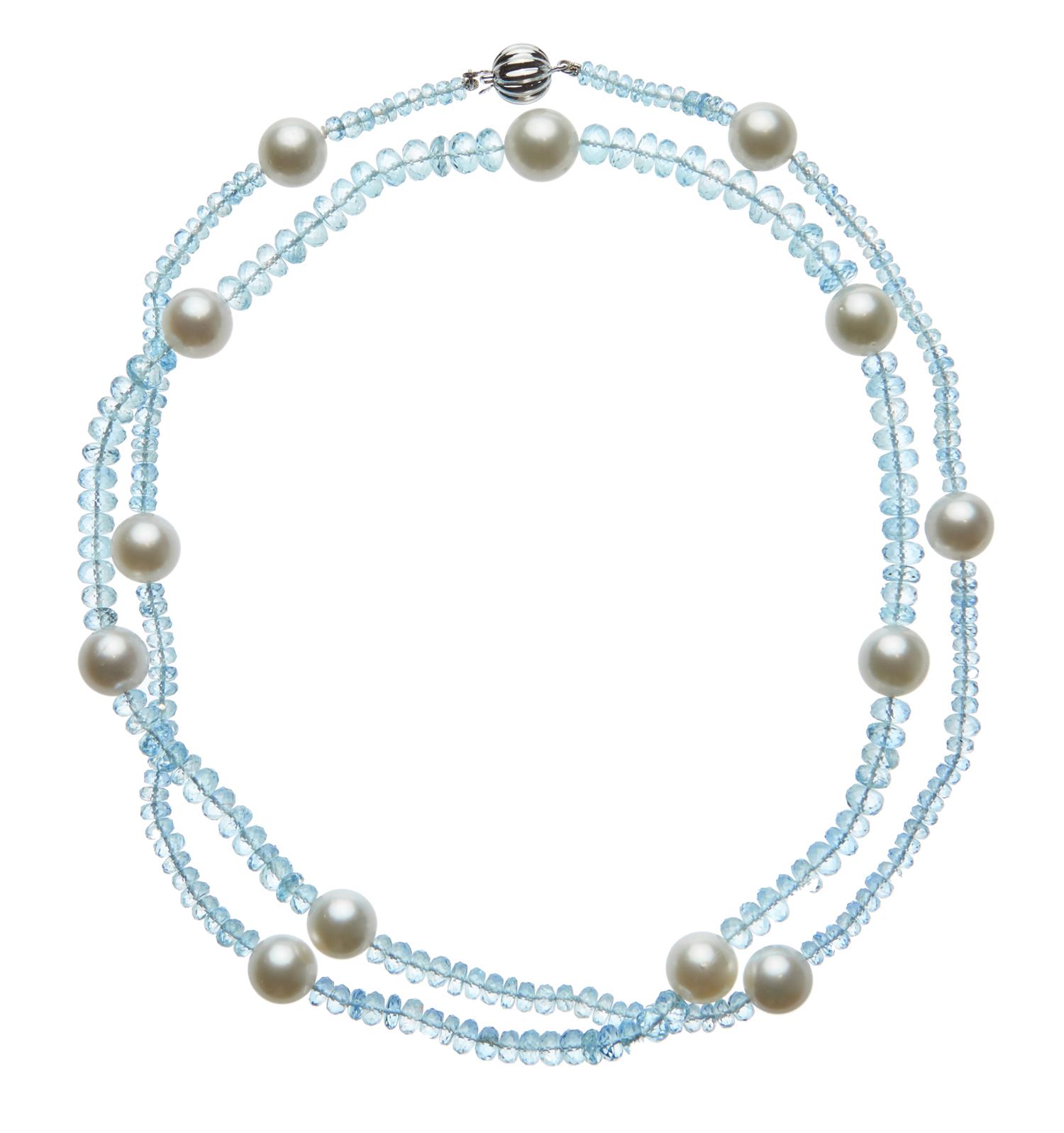 18CT WHITE GOLD, SOUTH SEA PEARL AND AQUAMARINE BEAD NECKLACE