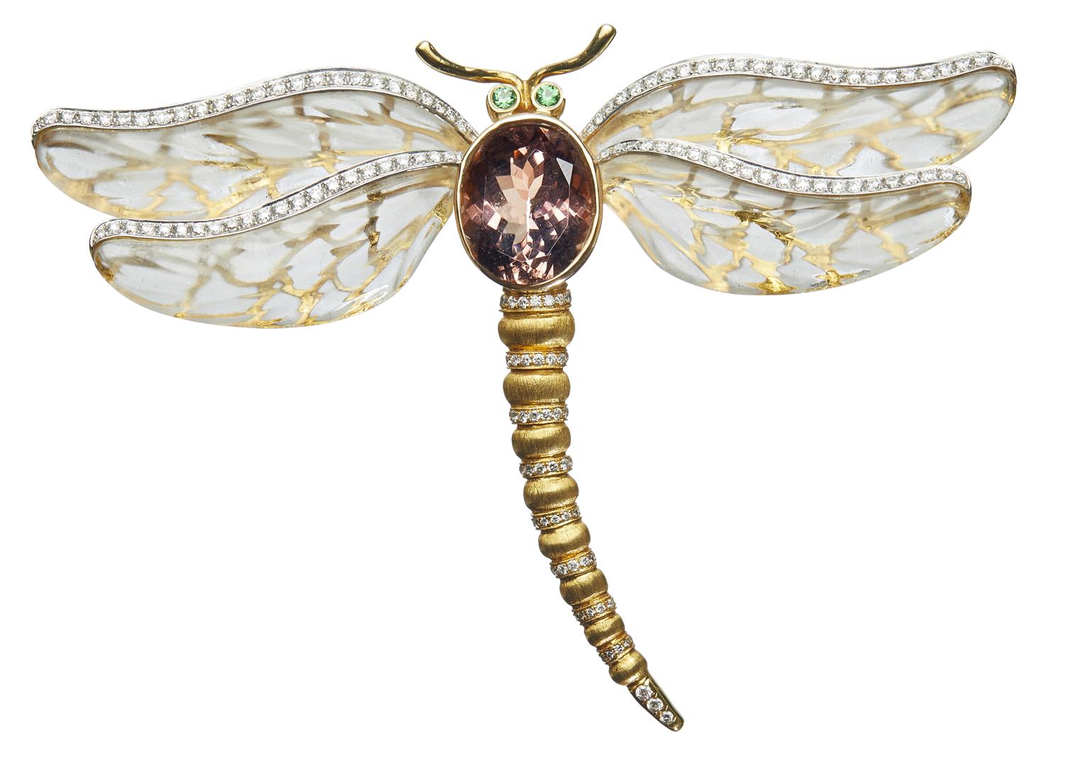 Modelled as a dragonfly, the thorax collet-set with an oval pink tourmaline, the wings embellished with frosted crystal partially edged with pavé-set brilliant-cut diamonds, the eyes accented with circular-cut tsavorite, the textured body decorated at intervals with diamonds, the tourmaline, tsavorite and diamonds together weighing approximately 4.62 carats, 0.96 carats and 0.06 carats respectively, length approximately 53mm.