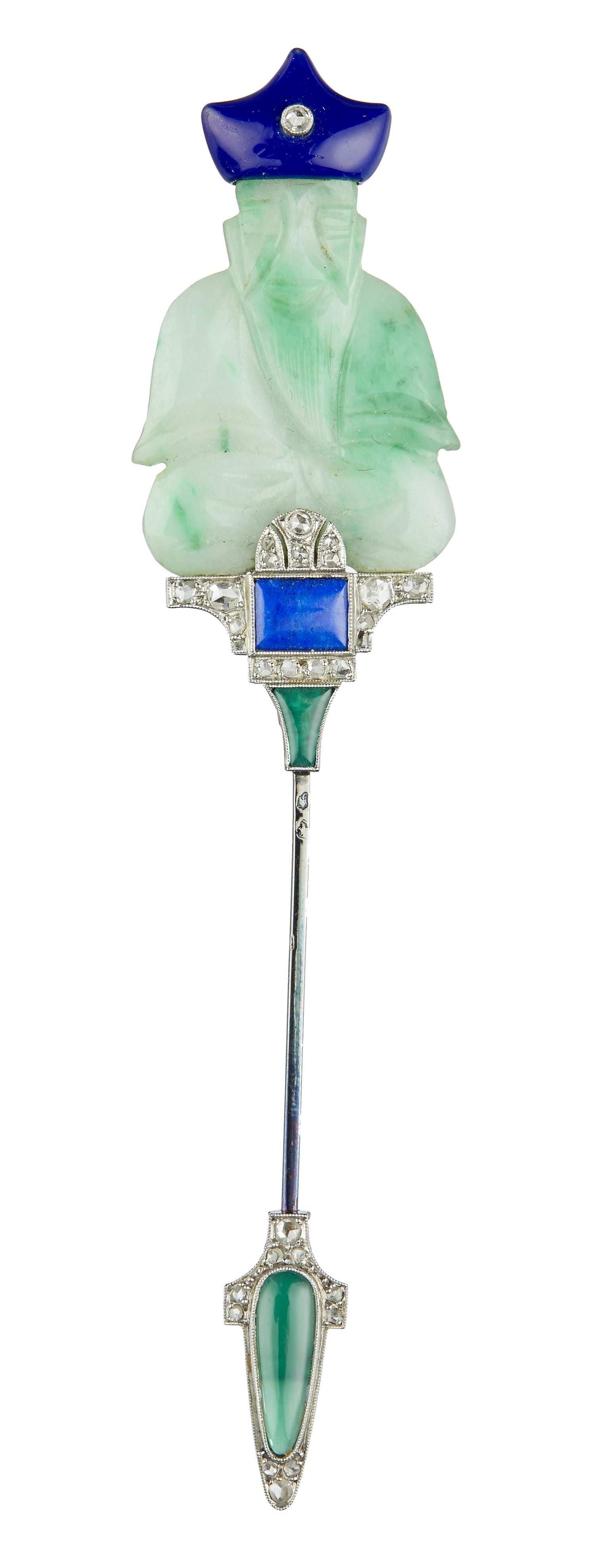 Set to the top with a double-sided carved jadeite plaque depicting the frontal profile of a seated figure between a blue lapis cap and throne accented by rose diamonds to a similarly set guard decorated with green chrysoprase, length approximately 100mm, French assay marks to pin, numbered 7944.