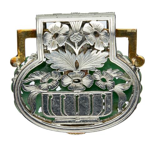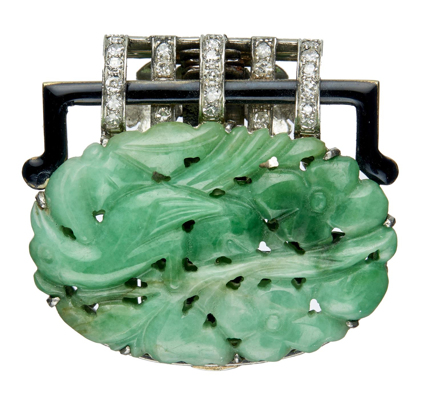 The oval-shaped jade plaque carved and pierced with floral motifs is surmounted by a line of scroll motifs pavé-set with circular-cut diamonds between a stylised gold bar applied with black enamel, the reverse with pierced-out jardinière motif, approximately 34 x 32mm, clip fitting.