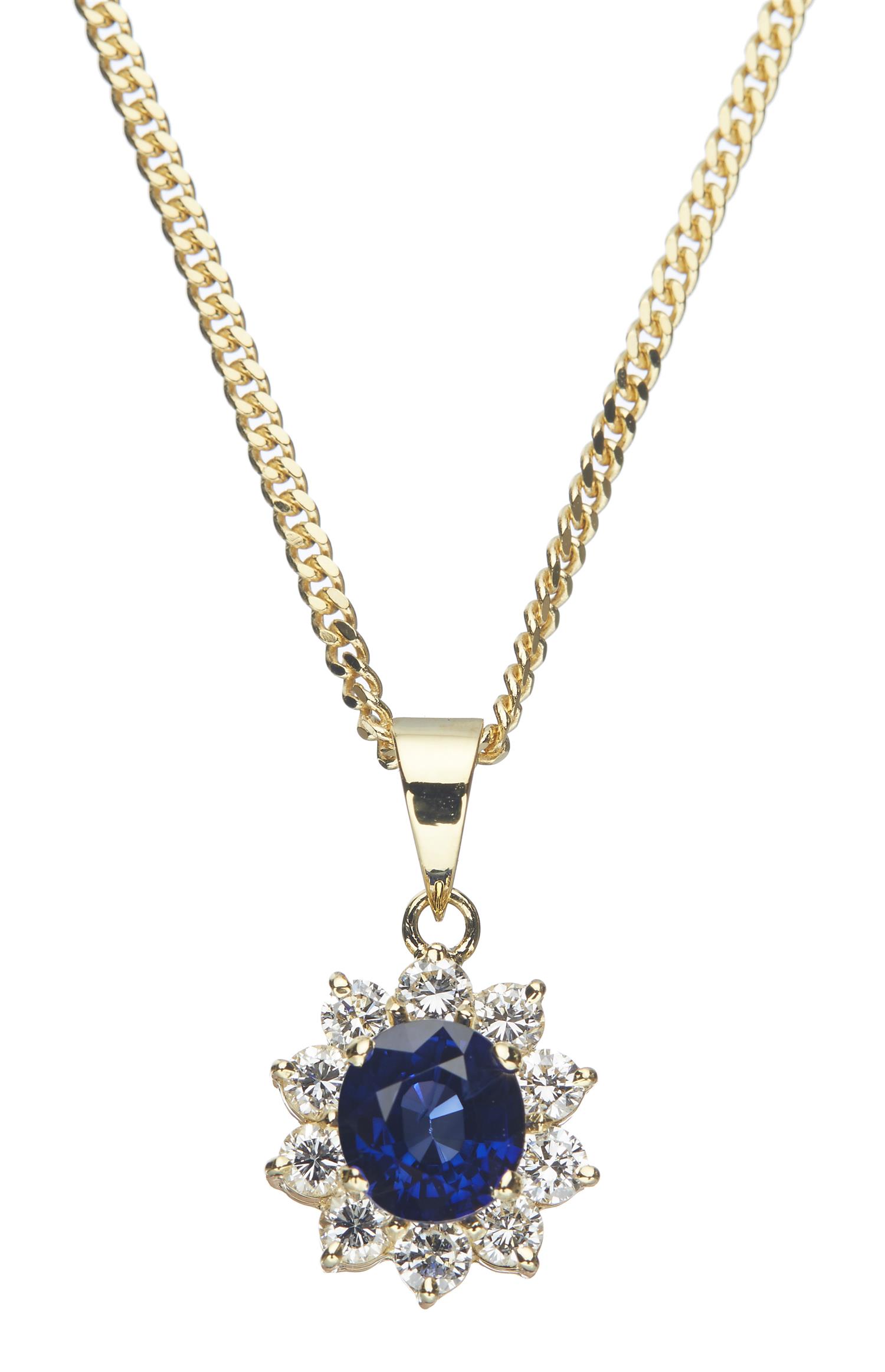 Of cluster design, centring an oval sapphire weighing approximately 0.87 carats, framed by ten brilliant-cut diamonds together weighing approximately 0.41 carats completed by a fine trace chain, pendant length approximately 13.5mm, chain circumference approximately 460mm.